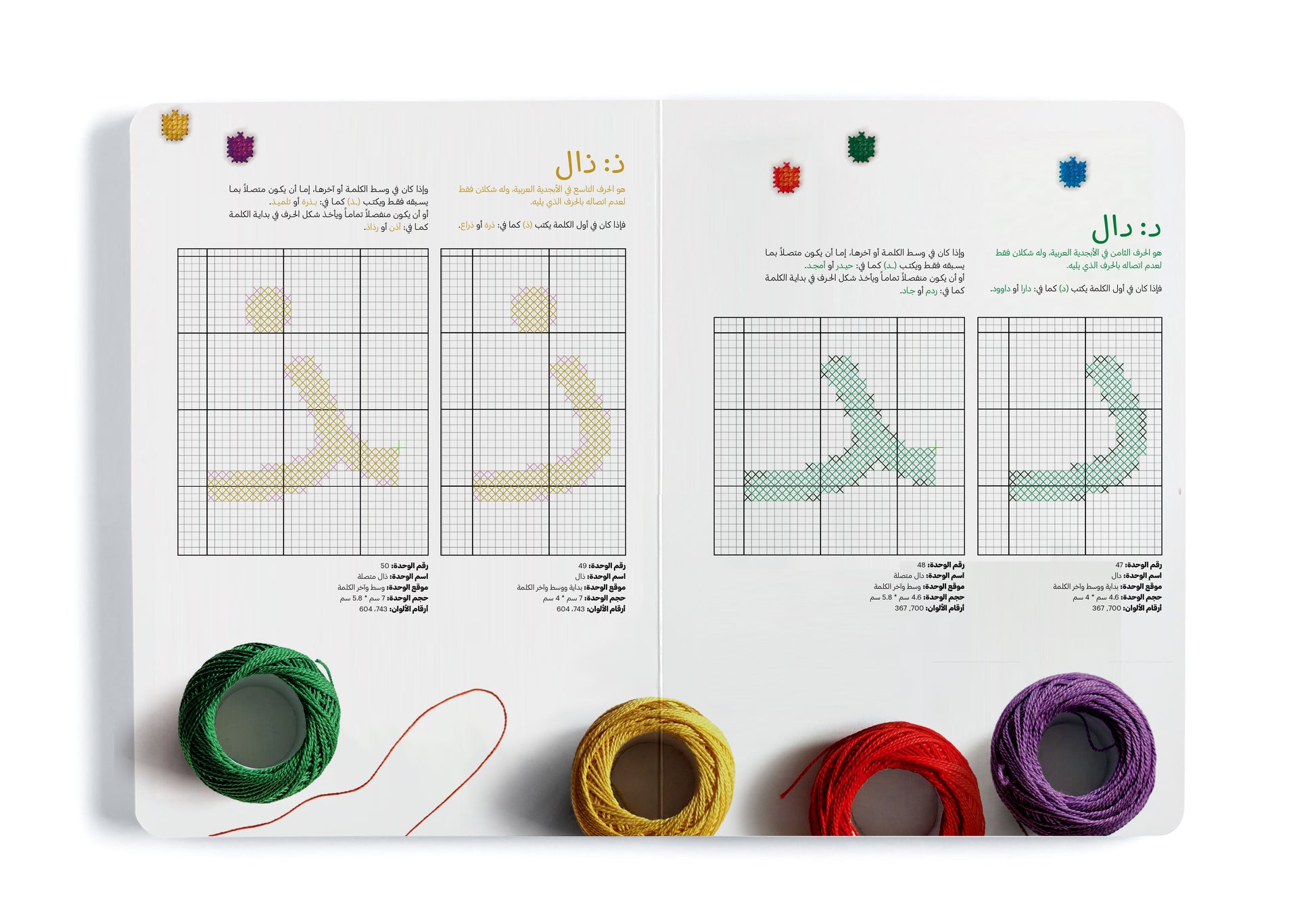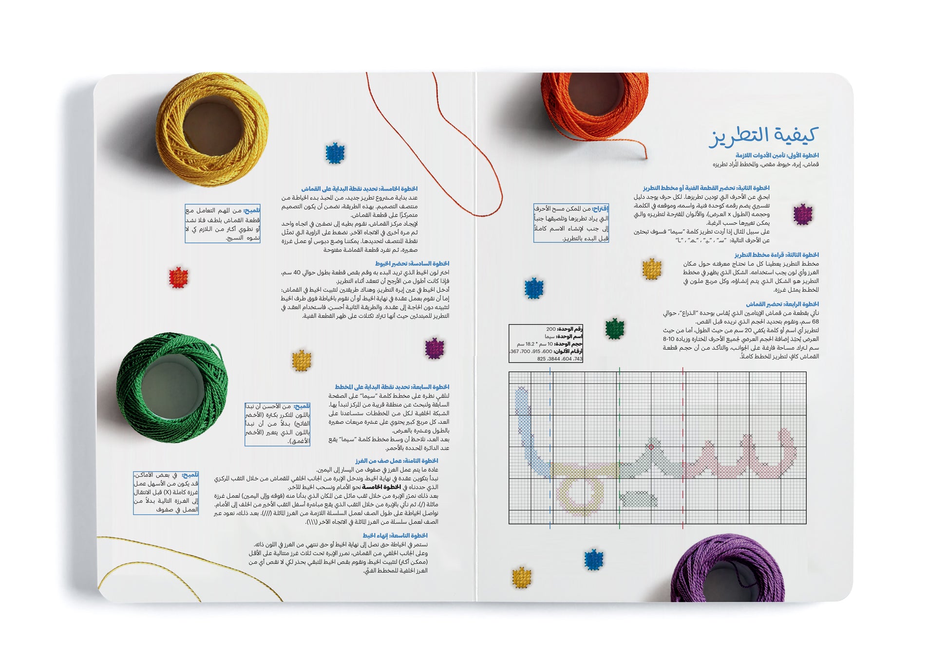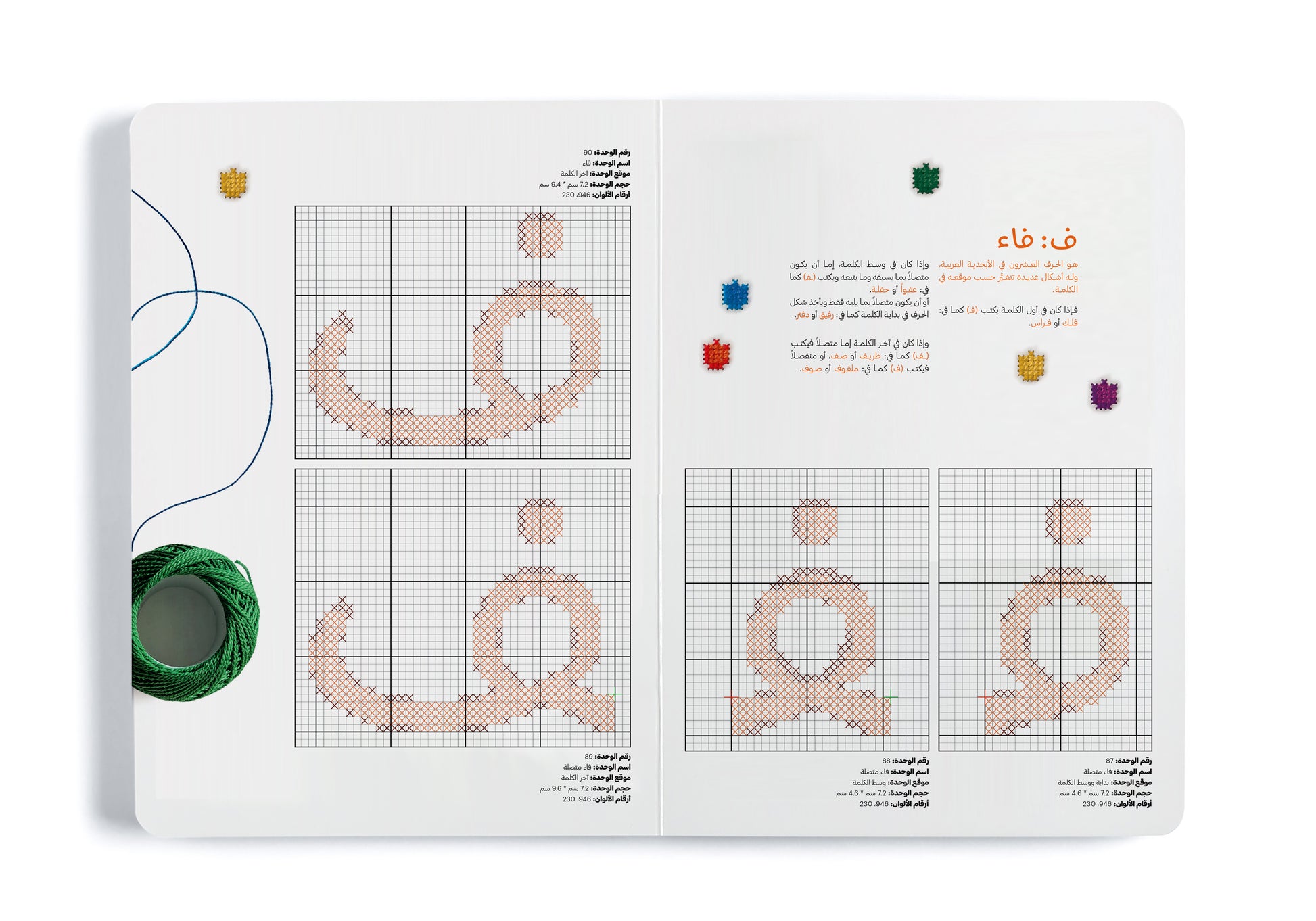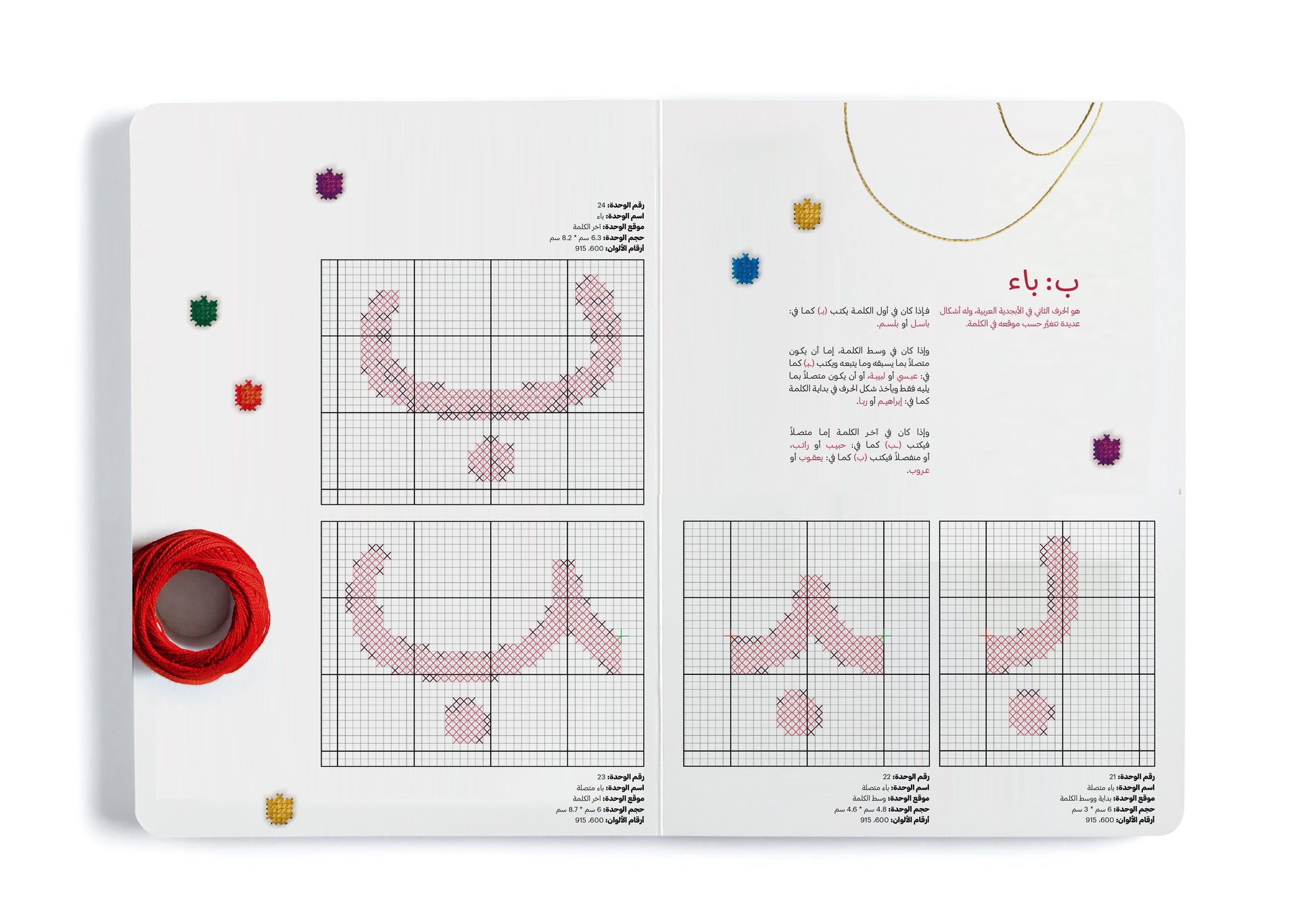 This book includes a simple introduction to understanding the essence and history of embroidery and provides a practical tool for learning the Arabic alphabet through 120 units representing the letters, illustrated according to their position in the word and drawn on grid paper, making them easier to embroider.